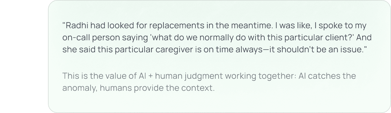 What started as a routine late arrival alert had uncovered a potential pattern of time discrepancies that manual oversight had missed. Without AI monitoring every clock-in in real-time and proactively reaching out when something seemed off, this pattern might have continued indefinitely—affecting compliance, billing accuracy, and client care.